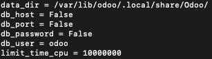In this file, go find db_user value. In this case, the db_user value is "odoo". That means, the user inside this machine that has responsible connecting odoo instance to postgresql database is a user named "odoo". You also need to remember the value of data_dir location, because this is the place where you will place your odoo addons and filestore.