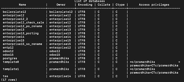 psql - Type in \l (small L letter) to see the list of your database. You need to know which database you are going to back up. So here you can see all the database name. Try to identify which one, and for this case we going to backup a database with the name odoo12.