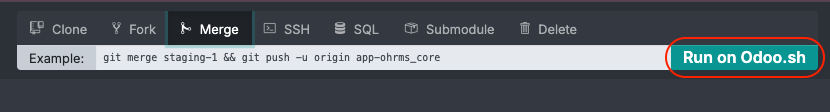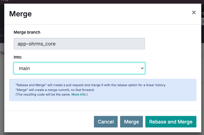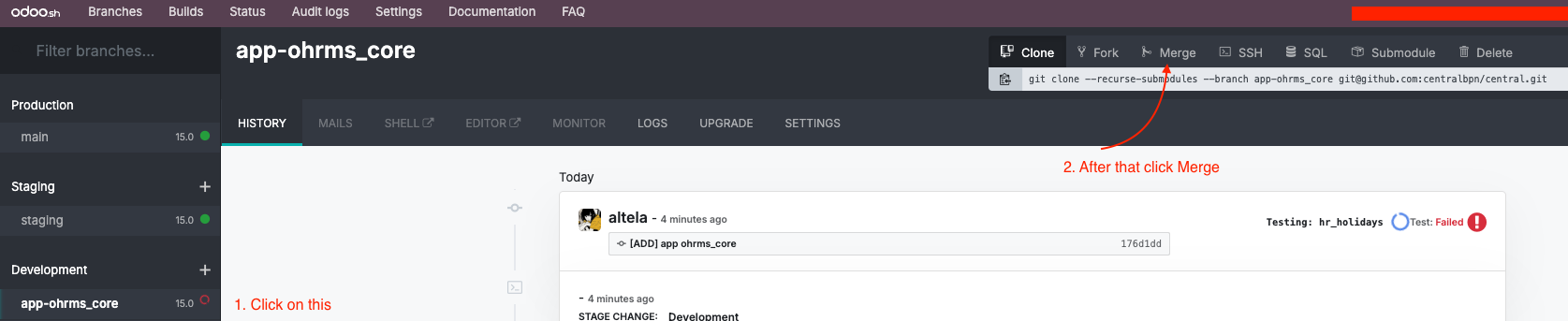 Now, what we'll need to do is we select the development branch (app-ohrms_core) and then select merge as picture below