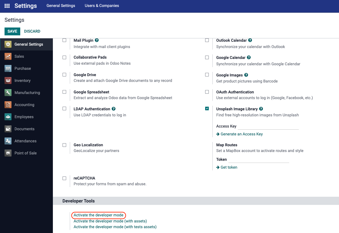 Now, log into your Odoo using your main administrator account. Enable the debug mode by go to settings menu > scroll down until you find "Activate the Developer Mode". Click on it
